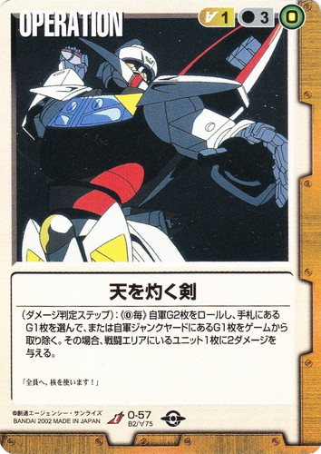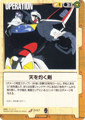 ![]() ![]() | O-57 天を灼く剣 OPERATION ベースドブースター2 U 色:茶 コスト[指定/合計(資源)]:茶1/3(0) (ダメージ判定ステップ):《0毎》自軍G2枚をロールし、手札にあるG1枚を選んで、または自軍ジャンクヤードにあるG1枚をゲームから取り除く。その場合、戦闘エリアにいるユニット1枚に2ダメージを与える。 「全員へ。核を使います!」 |