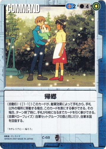 ![]() ![]() | C-68 帰郷 COMMAND エクステンションブースター2 色:青 コスト[指定/合計(資源)]:青2/4(0) (自動B):《[1・1]》このカードが、敵軍効果によって手札から、手札以外の場所に移動する場合、このカードを表にする事ができる。その場合、ターン終了時に、手札が6枚になるまでカードを引く事ができる。 (自軍ドローフェイズ):自軍セットグループの数と同じだけ、自軍本国を回復する。 「カサレリアに・・・帰ろう」 |