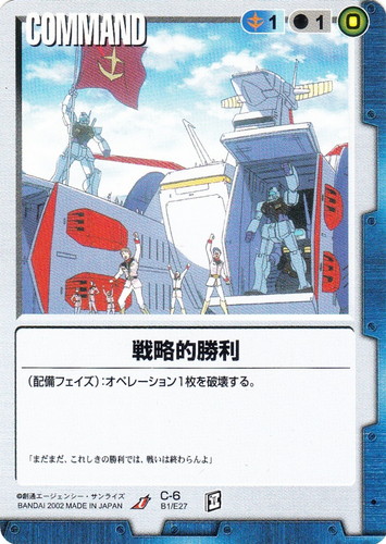 ![]() ![]() | C-6 戦略的勝利 COMMAND GUNDAM WAR U 色:青 コスト[指定/合計(資源)]:青1/1(0) (配備フェイズ):対象のオペレーション1枚を破壊する。 |