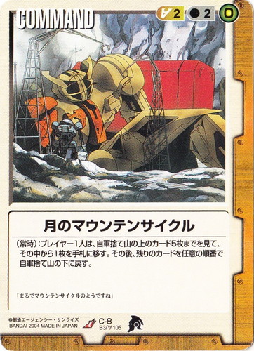 ![]() ![]() | C-8 月のマウンテンサイクル COMMAND ベースドブースター3 U 色:茶 コスト[指定/合計(資源)]:茶2/2(0) (常時):プレイヤー1人は、自軍捨て山の上のカード5枚までを見て、その中から1枚を手札に加える。その後、残りのカードを任意の順番で自軍捨て山の下に戻す。 「まるでマウンテンサイクルのようですね」 |