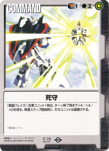 ![]() ![]() | C-18 死守 COMMAND ベースドブースター2 色:黒 コスト[指定/合計(資源)]:黒1/2(0) (戦闘フェイズ):自軍ユニット1枚は、ターン終了時まで+4/+4±0を得る。帰還ステップ開始時に、そのユニットは破壊される。 「来るなっ!!」 |