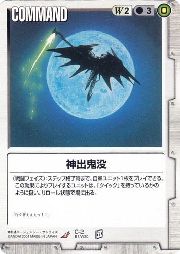 ![]() ![]() | C-2 神出鬼没 COMMAND ベースドブースター U 色:白 コスト[指定/合計(資源)]:白2/3(0) (戦闘フェイズ):ステップ終了時まで、自軍ユニット1枚をプレイできる。この効果によりプレイするユニットは、「クイック」を持っているかのように扱い、リロール状態で場に出る。 「行くぜぇぇぇっ!!」 |