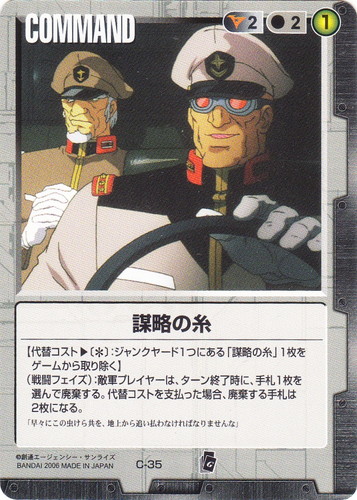 ![]() ![]() | C-35 謀略の糸 COMMAND エクステンションブースター 色:黒 コスト[指定/合計(資源)]:黒2/2① 【代替コスト▶[*]:ジャンクヤード1つにある「謀略の糸」1枚をゲームから取り除く】 (戦闘フェイズ):敵軍プレイヤーは、ターン終了時に、手札1枚を選んで廃棄する。代替コストを支払った場合、廃棄する手札は2枚になる。 「早々にこの虫けら共を、地上から追い払わなければなりませんな」 |