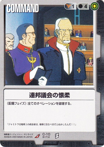 ![]() ![]() | C-10 連邦議会の懐柔 COMMAND GUNDAM WAR U 色:黒 コスト[指定/合計(資源)]:黒1/4(0) (配備フェイズ):場の全てのオペレーションを破壊する。 「これで、「地球連邦軍はティターンズの管轄下に入り、正義は我らのものというわけか・・・」 |