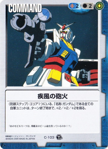 ![]() ![]() | C-103 疾風の砲火 COMMAND エクステンションブースター3 色:青 コスト[指定/合計(資源)]:青2/2(0) (防御ステップ):エリア1つにいる、「名称:ガンダム」である全ての自軍ユニットは、ターン終了時まで、+2/+2/+2を得る。 「あのモビルスーツは、戦艦並のビーム砲を持っているのか!?」 |