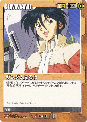 ![]() ![]() | C-X1 ガンダム売るよ COMMAND 月下の戦塵 U 色:茶 コスト[指定/合計(資源)]:茶1/3(0) (配備フェイズ):全てのプレイヤーは、手札1枚を選んで「掛け札」とした後、表にする。その場合、「掛け札」のコストの合計値が1番高いプレイヤーは、自軍ジャンクヤードにあるカード1枚を選んで手札に移し、その「掛け札」を廃棄する。それ以外のプレイヤーは「掛け札」を元の手札に戻す。 「さぁ、それじゃ5千万からスタートしようか!」 |