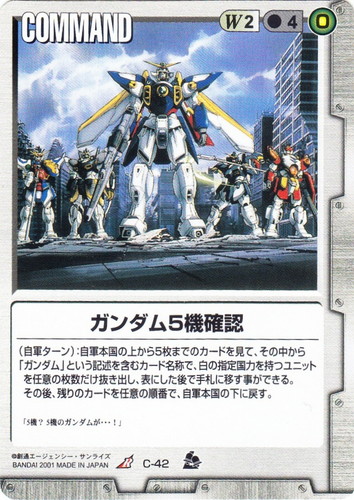 ![]() ![]() | C-42 ガンダム5機確認 COMMAND 革新の波濤 R 色:白 コスト[指定/合計(資源)]:白2/4(0) (自軍ターン):自軍本国の上から5枚までのカードを見て、その中から「ガンダム」という記述を含むカード名称で、白の指定国力を持つユニットを任意の枚数だけ抜き出し、表にした後で手札に移す事ができる。その後、残りのカードを任意の順番で、自軍本国の下に戻す。 「5機?5機のガンダムが・・・!」 |