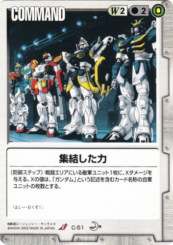 ![]() ![]() | C-51 集結した力 COMMAND 月下の戦塵 U 色:白 コスト[指定/合計(資源)]:白2/2(0) (防御ステップ):戦闘エリアにいる敵軍ユニット1枚に、Xダメージを与える。Xの値は、「ガンダム」という記述を含むカード名称の自軍ユニットの枚数とする。 「よし・・・行くぞ!」 |