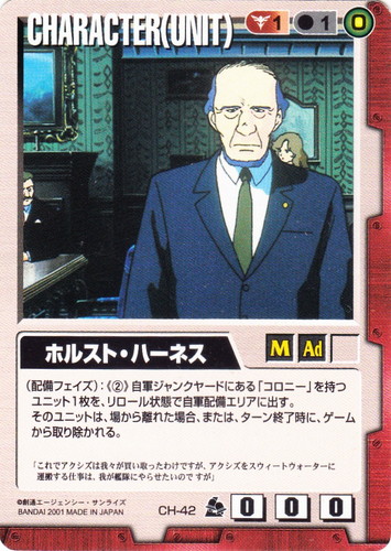 ![]() ![]() | CH-42 ホルスト・ハーネス CHARACTER 革新の波濤 色:赤 セット対象:UNIT コスト[指定/合計(資源)]:赤1/1(0) 格闘力:0 射撃力:0 防御力:0 特徴:男性/大人 (配備フェイズ):《②》自軍ジャンクヤードにある「コロニー」を持つユニット1枚を、リロール状態で自軍配備エリアに出す。そのユニットは、場から離れた場合、または、ターン終了時に、ゲームから取り除かれる。 「これでアクシズは我々が買い取ったわけですが、アクシズをスウィートウォーターに運搬する仕事は、我が艦隊にやらせたいのですが」 |