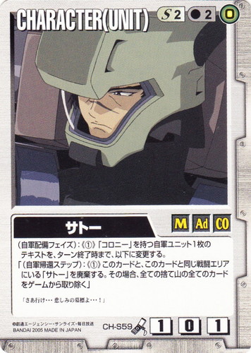 ![]() ![]() | CH-S59 サトー CHARACTER 果てなき運命 色:白 セット対象:UNIT コスト[指定/合計(資源)]:白2/2(0) 格闘力:1 射撃力:0 防御力:1 特徴:男性/大人/CO (自軍配備フェイズ):《①》「コロニー」を持つ自軍ユニット1枚のテキストを、ターン終了時まで、以下に変更する。 「(自軍帰還ステップ):《①》このカードと、このカードと同じ戦闘エリアにいる「サトー」を廃棄する。その場合、全ての捨て山の全てのカードをゲームから取り除く」 「さあ行け・・・悲しみの墓標よ・・・!」 |