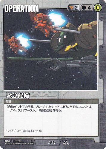 ![]() ![]() | O-87 緊急配備 OPERATION 栄光の戦史 色:黒 コスト[指定/合計(資源)]:黒2/4(0) 特徴:展開 (自動A):全ての手札、プレイされたカードにある、全てのユニットは、「クイック」「ブースト」「戦闘配備」を得る。 「このガブスレイで汚名返上と行くぜ」 |
