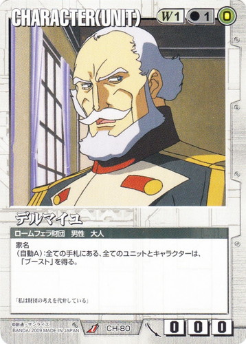 ![]() ![]() | CH-80 デルマイユ CHARACTER 武神降臨 U 色:白 セット対象:UNIT コスト[指定/合計(資源)]:白1/1(0) 格闘力:0 射撃力:0 防御力:0 特徴:ロームフェラ財団/男性/大人 家名 (自動A):全ての手札にある、全てのユニットとキャラクターは、「ブースト」を得る。 「私は財団の考えを代弁している」 |