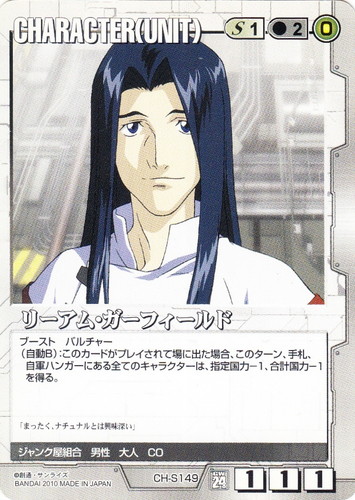 ![]() ![]() | CH-S149 リーアム・ガーフィールド CHARACTER 宇宙を駆逐する光 色:白 セット対象:UNIT コスト[指定/合計(資源)]:白1/2(0) 格闘力:1 射撃力:1 防御力:1 特徴:ジャンク屋組合/男性/大人/CO ブースト バルチャー (自動B):このカードがプレイされて場に出た場合、このターン、手札、自軍ハンガーにある全てのキャラクターは、指定国力-1、合計国力-1を得る。 「まったく、ナチュナルとは興味深い」 |