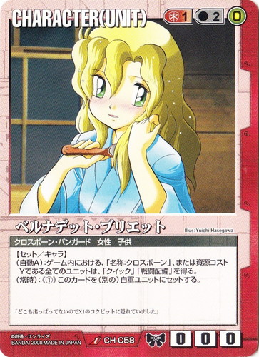 ![]() ![]() | CH-C58 ベルナデット・ブリエット CHARACTER ドラマチックブースター 戦場の女神2 U 色:赤 セット対象:UNIT コスト[指定/合計(資源)]:赤1/2(0) 格闘力:0 射撃力:0 防御力:0 特徴:クロスボーン・バンガード/女性/子供 【セット/キャラ】 (自動A):ゲーム内における、「名称:クロスボーン」、または資源コストYである全てのユニットは、「クイック」「戦闘配備」を得る。 (常時):《①》このカードを(別の)自軍ユニットにセットする。 「どこも出っぱってないのでX1のコクピットに隠れていました」 illust:Yuichi Hasegawa |