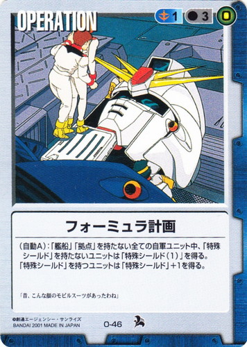 ![]() ![]() | O-46 フォーミュラ計画 OPERATION ベースドブースター3 色:青 コスト[指定/合計(資源)]:青1/3(0) (自動A):「艦船」「拠点」を持たない全ての自軍ユニット中、「特殊シールド」を持たない全ての自軍ユニットは、「特殊シールド(1)」を得る。「特殊シールド」を持つ全ての自軍ユニットは、「特殊シールド」+1を得る。 「ガンダムを立たせられるな?」 |