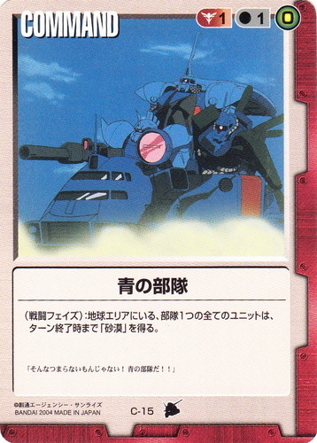 ![]() ![]() | C-15 青の部隊 COMMAND 宇宙の記憶 色:赤 コスト[指定/合計(資源)]:赤1/1(0) (戦闘フェイズ):地球エリアにいる、部隊1つの全てのユニットは、ターン終了時まで「砂漠」を得る。 「そんなつまらないもんじゃない!青の部隊だ!!」 |
