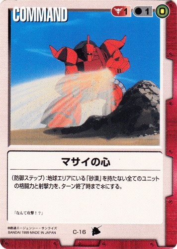 ![]() ![]() | C-16 マサイの心 COMMAND 宇宙の記憶 色:赤 コスト[指定/合計(資源)]:赤1/1(0) (防御ステップ):地球エリアにいる「砂漠」を持たない全てのユニットの格闘力と射撃力を、ターン終了時まで*にする。 「なんて攻撃!?」 |