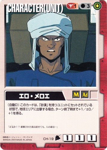 ![]() ![]() | CH-19 エロ・メロエ CHARACTER 宇宙の記憶 色:赤 セット対象:UNIT コスト[指定/合計(資源)]:赤1/3(0) 格闘力:1 射撃力:1 防御力:1 特徴:男性/大人 (自動D):このカードは「砂漠」を持つユニットにセットされている状態で、地球エリアに出撃する場合、ターン終了時まで+1/±0/+1を得る。 「正気か!?破壊された街は直せても、人の命は・・・」 |