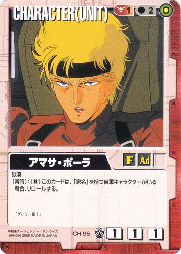 ![]() ![]() | CH-95 アマサ・ポーラ CHARACTER 覇王の紋章 色:赤 セット対象:UNIT コスト[指定/合計(資源)]:赤1/2(0) 格闘力:1 射撃力:1 防御力:1 特徴:女性/大人 砂漠 (常時):《0》このカードは、「家名」を持つ自軍キャラクターがいる場合、リロールする。 「グレミー様!」 |