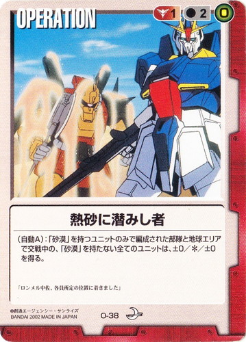 ![]() ![]() | O-38 熱砂に潜みし者 OPERATION 月下の戦塵 色:赤 コスト[指定/合計(資源)]:赤1/2(0) (自動A):「砂漠」を持つユニットのみで編成された部隊と地球エリアで交戦中の、「砂漠」を持たない全てのユニットは±0/*/±0を得る。 「ロンメル中佐、各自所定の位置に着きました」 |