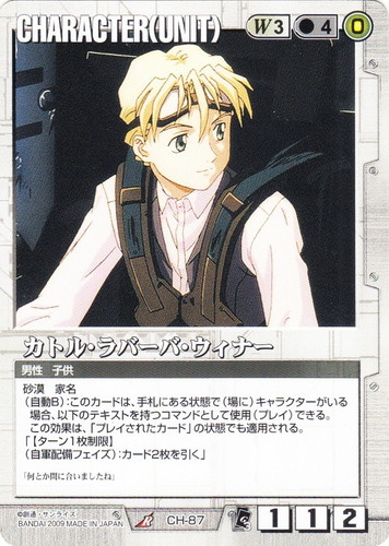 ![]() ![]() | CH-87 カトル・ラバーバ・ウィナー CHARACTER エクステンションブースター3 R 色:白 セット対象:UNIT コスト[指定/合計(資源)]:白3/4(0) 格闘力:1 射撃力:1 防御力:2 特徴:男性/子供 砂漠 家名 (自動B):このカードは、手札にある状態で(場に)キャラクターがいる場合、以下のテキストを持つコマンドとして使用(プレイ)できる。この効果は、「プレイされたカード」の状態でも適用される。 「【ターン1枚制限】 (自軍配備フェイズ):カード2枚を引く」 「何とか間に合いましたね」 |