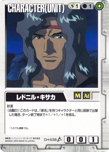 ![]() ![]() | CH-S39 レドニル・キサカ CHARACTER 宿命の螺旋 色:白 セット対象:UNIT コスト[指定/合計(資源)]:白1/1(0) 格闘力:0 射撃力:0 防御力:1 特徴:男性/大人 砂漠 (自動D):このカードは、「家名」を持つキャラクターと同じ部隊で出撃した場合、ターン終了時まで+1/+1/+1を得る。 「これでも護衛でね」 |