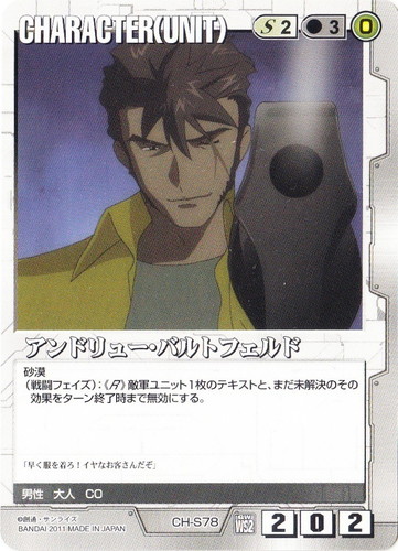 ![]() ![]() | CH-S78 アンドリュー・バルトフェルド CHARACTER DXウィナーズスターター 純白の鋼翼 色:白 セット対象:UNIT コスト[指定/合計(資源)]:白2/3(0) 格闘力:2 射撃力:0 防御力:2 特徴:男性/大人/CO 砂漠 (戦闘フェイズ):《R》敵軍ユニット1枚のテキストと、まだ未解決のその効果をターン終了時まで無効にする。 「早く服を着ろ!イヤなお客さんだぞ」 |