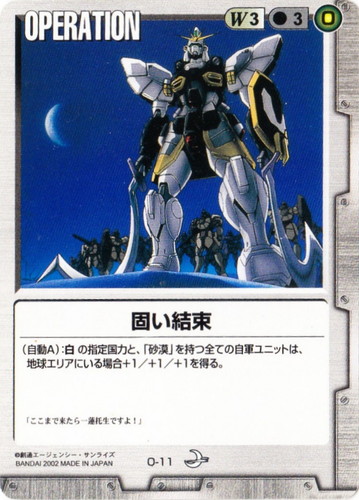 ![]() ![]() | O-11 固い結束 OPERATION 月下の戦塵 色:白 コスト[指定/合計(資源)]:白3/3(0) (自動A):白の指定国力と、「砂漠」を持つ全ての自軍ユニットは、地球エリアにいる場合+1/+1/+1を得る。 「ここまで来たら一蓮托生ですよ!」 |