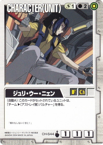 ![]() ![]() | CH-S44 ジュリ・ウー・ニェン CHARACTER 烈火の咆哮 色:白 セット対象:UNIT コスト[指定/合計(資源)]:白1/2(0) 格闘力:1 射撃力:1 防御力:1 特徴:女性/子供 (自動A):このカードがセットされているユニットは、「チーム▶〔アストレイ隊〕バルチャー」を得る。 「乗れもしないくせに!」 |
