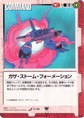 ![]() ![]() | C-86 ガザ・ストーム・フォーメーション COMMAND 変革の叛旗 U 色:赤 コスト[指定/合計(資源)]:赤1/1(0) (戦闘フェイズ):自軍部隊1つを指定する。その場合、敵軍カードX枚までをロールする。Xの値は、指定した部隊にいる「ガザの嵐隊」であるユニットの枚数の2倍とする。 「大気圏戦闘用に考えた、ガザ・ストームだ」 |