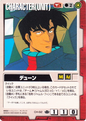 ![]() ![]() | CH-92 デューン CHARACTER 禁忌の胎動 色:赤 セット対象:UNIT コスト[指定/合計(資源)]:赤1/2(0) 格闘力:1 射撃力:1 防御力:0 特徴:男性/大人 クイック (自動A):自軍ユニットが3枚以上いる場合、このカードがセットされているユニットは、「チーム▶[ジャムル3D]±0/+1/±0」を得る。 (自動A):手札にある「名称:ジャムル・フィン」である全てのユニットは、「クイック」を得る。 「アーガマを倒してこそ、出世もできるというものだ」 |