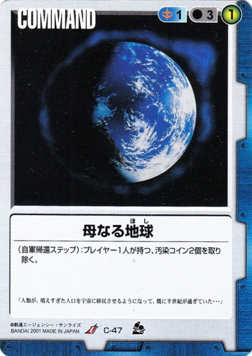 ![]() ![]() | C-47 母なる地球 COMMAND 革新の波濤 U 色:青 コスト[指定/合計(資源)]:青1/3① (自軍帰還ステップ):プレイヤー1人が持つ、汚染コイン2個を取り除く。 「人類が、増えすぎた人口を宇宙に移民させるようになって、既に半世紀が過ぎていた・・・」 |