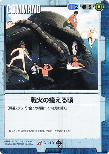 ![]() ![]() | C-119 戦火の癒える頃 COMMAND 戦慄の兵威 U 色:青 コスト[指定/合計(資源)]:青2/5(0) (帰還ステップ):全ての汚染コインを取り除く。 「長く苦しかった戦争もついに終わり、平和の日々が訪れました」 |