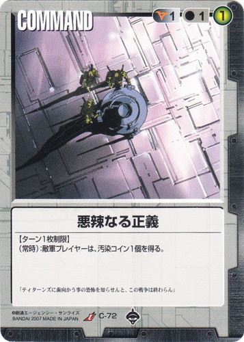 ![]() ![]() | C-72 悪辣なる正義 COMMAND 戦慄の兵威 U 色:黒 コスト[指定/合計(資源)]:黒1/1① 【ターン1枚制限】 (常時):敵軍プレイヤーは、汚染コイン1個を得る。 「ティターンズに歯向かう事の恐怖を知らせんと、この戦争は終わらん」 |