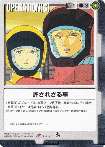![]() ![]() | O-27 許されざる事 OPERATION 新世紀の鼓動 U 色:黒 セット対象:G コスト[指定/合計(資源)]:黒1/3(0) (自動D):このカードは、自軍ターン終了時に廃棄される。その場合、自軍プレイヤーは汚染コイン1個を得る。 (注:ターン終了時に、汚染コインを10個以上持つプレイヤーは敗北となる) 「なぜ、こんな風に人が殺せるんです!!」 |