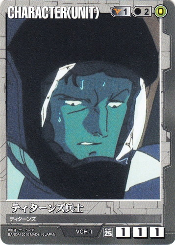 ![]() ![]() | VCH-1 ティターンズ兵士 CHARACTER 戦いという名の対話 色:黒 セット対象:UNIT コスト[指定/合計(資源)]:黒1/2(0) 格闘力:1 射撃力:1 防御力:1 特徴:ティターンズ |