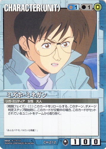![]() ![]() | CH-212 ミズホ・ミネガン CHARACTER 流転する世界 色:青 セット対象:UNIT コスト[指定/合計(資源)]:青1/1(0) 格闘力:1 射撃力:0 防御力:0 特徴:リガ・ミリティア/女性/大人 (戦闘フェイズ):《①》このカードをリロールする。このターン、ダメージ判定ステップ開始時に、このカードが交戦中の場合、このカードがセットされているユニットをゲームから取り除く。 「あんなバケモノみたいな戦艦!」 |