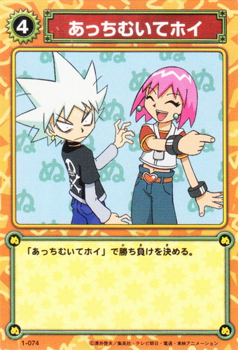 ![]() ![]() | 1-074 あっちむいてホイ ミニゲーム 発動! 聖鼻毛領域 パワー:4 「あっちむいてホイ」で勝ち負けを決める。 |