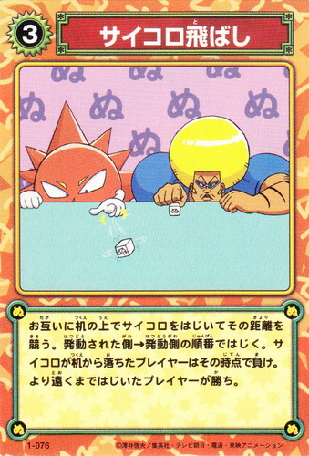 ![]() ![]() | 1-076 サイコロ飛ばし ミニゲーム 発動! 聖鼻毛領域 パワー:3 お互いに机の上でサイコロをはじいてその距離を競う。発動された側→発動側の順番ではじく。サイコロが机から落ちたプレイヤーはその時点で負け。より遠くまではじいたプレイヤーが勝ち。 |