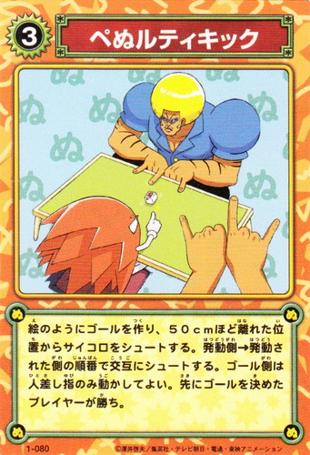 ![]() ![]() | 1-080 ペぬルティキック ミニゲーム 発動! 聖鼻毛領域 パワー:3 絵のようにゴールを作り、50cmほど離れた位置からサイコロをシュートする。発動側→発動された側の順番で交互にシュートする。ゴール側は人差し指のみ動かしてよい。先にゴールを決めたプレイヤーが勝ち。 |