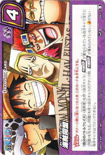![]() ![]() | 32 “赤旗”X・ドレーク キャラ ONEPIECE 超激闘編 ブースターパック 第1弾 新世界の強者たち 色:紫 キャラ:ドレーク 属性:海賊/船長/超新星 コスト:2 悪魔の実(1):1000 『このキャラのアタック時』:JP▶破棄 このキャラと同じコストの相手キャラ1枚を破壊する。 【悪魔の実】が重ねられているとき、このキャラのコストを3にしてBP+2000する。 しまった・・・“黄猿”とは出逢うつもりはなかった 作品名:ONE PIECE |