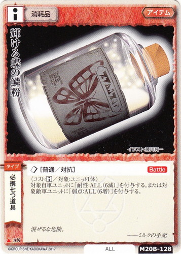 ![]() ![]() | M20B-128 輝ける蝶の鱗粉 アイテム 月の銀の魔狼 ▲ 分類:消耗品 ブロック:AN 勢力:ALL タイプ:必携七つ道具 ◇[普通/対抗]【Battle】 〈コスト:□/対象:ユニット1体〉 対象自軍ユニットに「耐性:ALL(6減)」を付与する。または対象敵軍ユニットに「弱点:ALL(6増)」を付与する。 混ぜるな危険。 ――ミルクの手記 illustrated by 藤川純一 |
