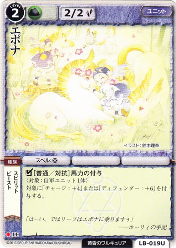 ![]() ![]() | LB-019U エポナ ユニット 不滅なる聖騎士 ◆ 属性:土 種族:ビースト/スピリット ブロック:LE レベル:(2) 攻撃力:2 防御力:2 進軍タイプ:歩行 勢力:黄昏のワルキュリア スペル:* □[普通/対抗]馬力の付与 〈対象:自軍ユニット1体〉 対象に「チャージ:+4」または「ディフェンダー:+6」を付与する。 「はーい、ではリーフはエポナに乗りますぅ」 ――ホーリィの手記 illustrated by 鈴木理華 |