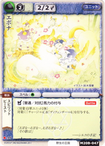 ![]() ![]() | M20B-047 エポナ ユニット 月の銀の魔狼 ◆ 属性:土 種族:ビースト/スピリット ブロック:AN レベル:(2) 攻撃力:2 防御力:2 進軍タイプ:歩行 勢力:野生の王国 スペル:土 □[普通/対抗]馬力の付与【Battle】 〈対象:自軍ユニット1体〉 対象に「チャージ:+4」&「ディフェンダー:+6」を付与する。 「えぽなーえぽなー、えぽえぽなー♪」 「その歌は!」 ――シルクの手記 illustrated by 鈴木理華 |