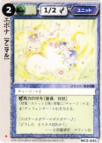 ![]() ![]() | MC5-041 エポナ ユニット 星剣姫の烙印 ▲ 属性:土 種族:アニマル レベル:(2) 攻撃力:1 防御力:2 進軍タイプ:歩行 チャージ:+2 □馬力の付与[普通/対抗] 〈対象:ユニット1体〉対象に「チャージ:+3」&「ディフェンダー:+6」を与える。 「エポナーエポナーエポエポナー!」 「どうした、もうネタ切れか?」 ――七星魔導史 マフィン伝 illustrated by 鈴木理華 |