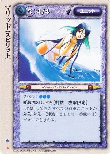 ![]() ![]() | マリッド ユニット 六王国の戦火 ★ 属性:水 種族:スピリット ブロック:六王国 レベル:5 攻撃力:4 防御力:4 進軍タイプ:歩行 スペル:水水水 □激流のしぶき[対抗:攻撃限定] 「攻撃」してきたすべての敵軍ユニットが対象。対象に【津波:2Dして一番低い目】ダメージを与える。 illustrated by Kyoko Tsuchiya |