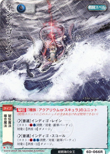 ![]() ![]() | 6D-066R インディゴ・レイン 戦闘スペル 悠久のハルシオン ★ 属性:水 ブロック:V/VI 勢力:紺碧海の女王 タイプ:複合魔法/秘伝魔法 【秘伝】「種族:アクアリウムorスキュラ」のユニット(使用ユニットにこのユニットが含まれなければ使用できない) ◇[普通]インディゴ・レイン 〈コスト:火水消費/対象:敵軍パーティ〉 対象に【津波:8】ダメージ。 ◇[普通]インディゴ・スコール 〈コスト:火水水消費/対象:敵軍パーティ〉 対象に【津波:12】ダメージ。 illustrated by I☆LA |