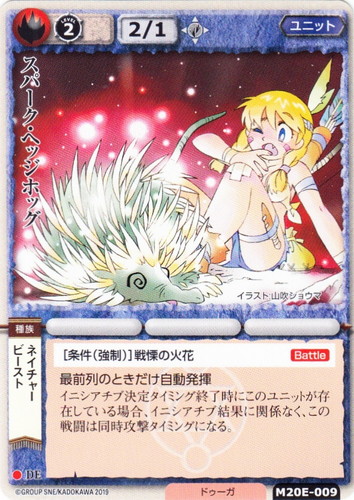 ![]() ![]() | M20E-009 スパーク・ヘッジホッグ ユニット モンスター・コレクションDeus ● 属性:火 種族:ビースト/ネイチャー ブロック:DE レベル:(2) 攻撃力:2 防御力:1 進軍タイプ:歩行 勢力:ドゥーガ [条件(強制)]戦慄の火花【Battle】 最前列のときだけ自動発揮 イニシアチブ決定タイミング終了時にこのユニットが存在している場合、イニシアチブ結果に関係なく、この戦闘は同時攻撃タイミングになる。 illustrated by 山吹ショウマ |
