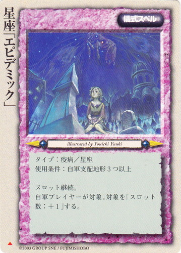 ![]() ![]() | 星座「エピデミック」 儀式スペル 時間獣の封印 ▲ タイプ:疫病/星座 使用条件:自軍支配地形3つ以上 スロット待機。 自軍プレイヤーが対象。対象を「スロット数:+1」する。 illustrated by Youichi Yuuki |