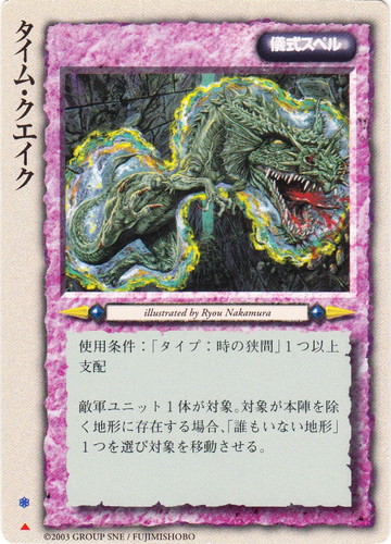 ![]() ![]() | タイム・クエイク 儀式スペル 時間獣の封印 ▲ ブロック:六王国 使用条件:「タイプ:時の狭間」1つ以上支配 敵軍ユニット1体が対象。対象が本陣を除く地形に存在する場合、「誰もいない地形」1つを選び対象を移動させる。 illustrated by Ryou Nakamura |